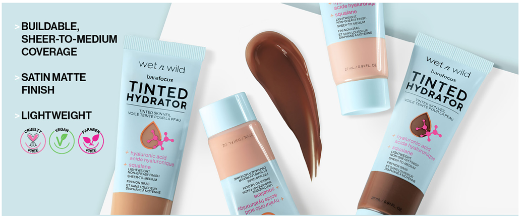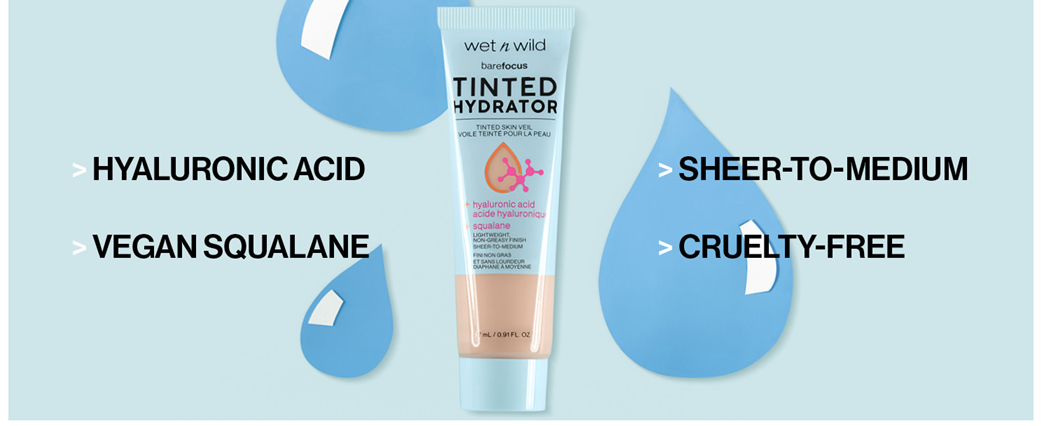 More than just a moisturizer, the Bare Focus Tinted Hydrator Tinted Skin Veil perfects with sheer-to-medium coverage, while granting your skin some seriously intense hydration. Formulated with hyaluronic acid and vegan squalane, this is a one-way ticket to quenched perfection! Buildable with a semi-matte finish, this two-in-one miracle creates a naturally flawless and nourished glow. Use it to transform a multi-step routine into a one-step regimen, so you’ll be ready in a splash with this lightweight, multipurpose, and super convenient formula. If that’s not a beauty dream destination, we don’t know what is! Simply tap, blend and build to your preferred coverage for hydrated, radiant, instant perfection. Select from our versatile range of shades to transport yourself to complexion paradise! wet n wild starts as everyone’s first and remains a lifelong destination for vibrant and accessible beauty. Delivering over 40 years of trend-forward and all-inclusive innovations, we are your trusted beauty expert that will keep you looking fabulous without ever betraying your budget. From the bold ‘n’ bright to the neutral ‘n’ nuanced, we set out to spoil you with options while setting the gold standard of achievability. So go ahead, get your feet wet with us again and go wild with your imagination!