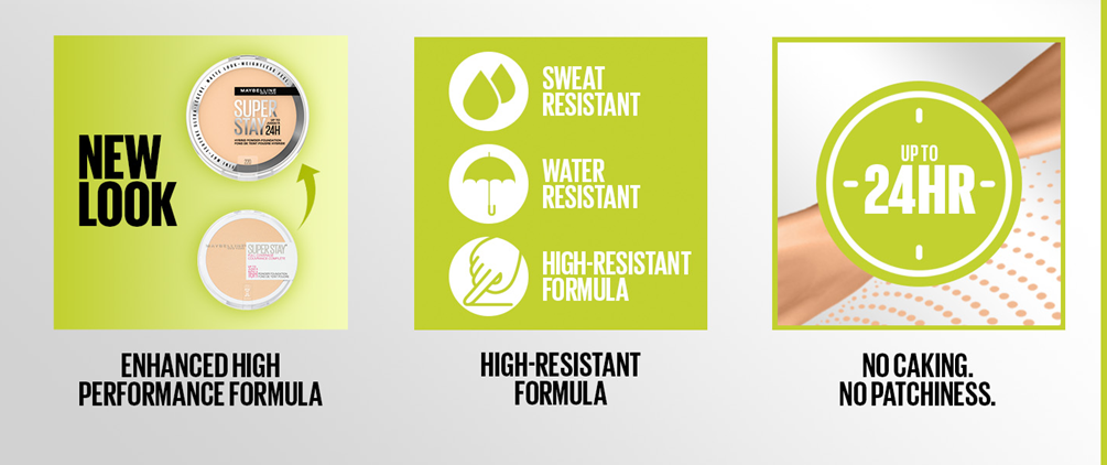- Soft Matte Make Up Look: Maybelline New York Super Stay Hybrid Powder Foundation gives up to 24 hours of medium-to-full foundation coverage with a soft matte finish. Comfortable, weightless feel that resists sweat, water or makeup transfer
