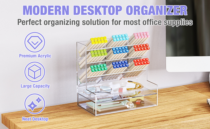 • ✔️【Easy to Use】We designed a triangular crystal handle for the drawer, which is convenient for you to pull out the drawer. Our acrylic desk organizer comes assembled, all you need to do is unpack it and it's ready to use.