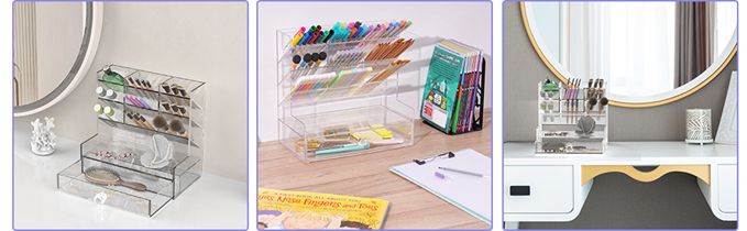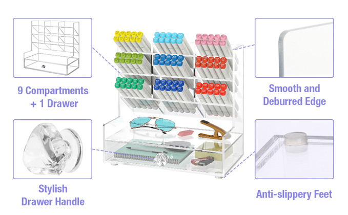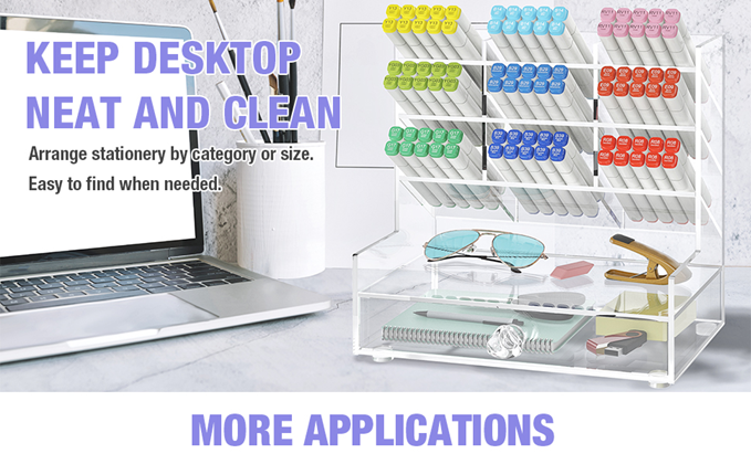 • ✔️【Premium Material & Excellent Workmanship】This clear acrylic storage rack is made of high-quality acrylic plexiglass with smooth edges and an elegant appearance, striking a good balance between performance and aesthetics. There are non-slip feet on the bottom of the desk organizer to keep it stable and protect the desktop from scratches.