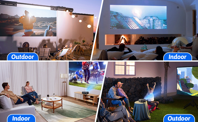 - Mini Portable Projector: This Portable projector is designed in small size ( 5.63"*3.78"*2.28"/0.75 lb ). It is small enough to fit in your bag. Therefore, it is rather light and handy to carry when you go out(Support Power Bank Supply). Ideal for home theater projector video in the backyard, hosting parties, and movie nights while traveling.