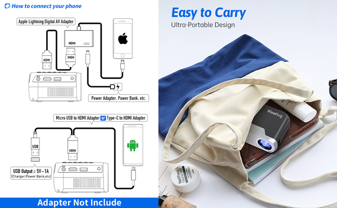 - What You’ll Get: The package including 1 x Mini Portable Projector, 1 x Mini Portable Projector Manual, 1 x remote contorl(Battery not included),1 x power adapter,1 x HDMI cable. woohug small projector provide excellent customer service, any product problem pls feel free to contact us.