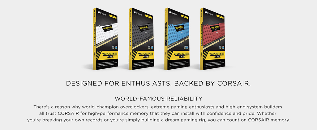 VENGEANCE LPX memory is designed for high-performance overclocking. The heatspreader is made of pure aluminum for faster heat dissipation, and the custom performance PCB helps manage heat and provides superior overclocking headroom. Each IC is individually screened for performance potential. The DDR4 form factor is optimised for the latest Intel and AMD DDR4 motherboards and offers higher frequencies, greater bandwidth, and lower power consumption than DDR3 modules. VENGEANCE LPX DDR4 modules are compatibility-tested across Intel DDR4 motherboards for reliably fast performance. They’re available in multiple colors to match your motherboard, your components, or just your style.