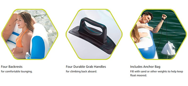 The Intex relaxation island is an inflatable water raft that can seat you and 5 of your friends for a great day out on the lake. There are 6 cup holders and a built-in cooler to keep drinks on hand for everyone. The center of the float does not have a mesh floor so you can stick your feet in and cool off. If you're still feeling hot, hop into the water and hold onto the boarding platform's grab handles. You can bob alongside the float. Oversized backrests made the ride extra comfortable for 4. The other riders can lay out and get some sun on the Float's deck. Included is an anchor bag that you can fill with sand to keep the float moored and a repair patch kit in case you hit some rough seas. Have a blast out on the water this summer with your friends and family with the Intex relaxation island. Product features: super-sized inflatable floating island accommodates large families or lots of friends. Engineered with a perfectly contoured and angled 3 person lounger for sun tanning. Features four upright seats with comfortable back rests and open floor swim-through access. Two inflatable swim-up boarding platforms are used to get on and off the float. Includes: 6 cup holders, built-in cooler, handy grab rope, and anchor bag.