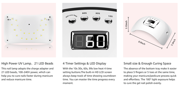 • 【Safe & Comfort】Our uv led nail light has no harm to eyes and hands, and the gel lamp also protects your skin from getting darker. The spacious space is enough to put in your whole hands or toes without worrying about the sides not curing.