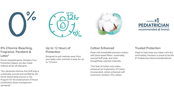 Your search for pure protection that works is over! Designed to help skin stay dry and healthy, Pampers Pure Protection diapers lock wetness away from skin for up to 12 hours for outstanding leakage protection with skin-loving care. Plus, our designer, boutique prints make Pampers Pure just as precious as they are protecting. We've thoughtfully chosen all of our ingredients to care for your baby's precious skin. Our exclusive, plant-based liner** is enriched with shea butter to help nourish and protect skin while our outercover is enhanced with premium cotton, making Pampers Pure Protection diapers irresistibly soft and breathable. But the ingredients we've chosen to leave out are just as important. That's why Pampers Pure Protection diapers are free of chlorine bleaching, fragrance, parabens, and latex* and are hypoallergenic. *Natural rubber **Plant-based and polypropylene blend The Seal of Cotton and cotton enhanced are trademarks of Cotton Incorporated. cotton enhanced soft outercover contains 15% cotton.