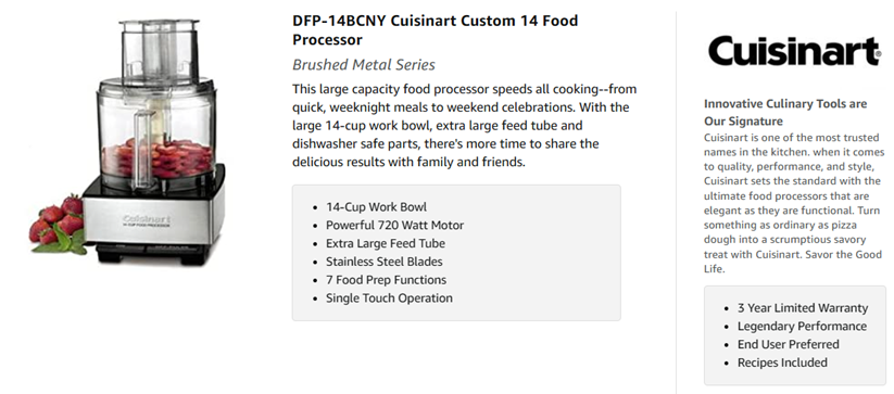 The Cuisinart DFP-14BCNY custom food Processor has an extra-large Feed tube that holds whole fruits and vegetables. Features a 14-Cup work bowl, 4mm stainless steel Medium slicing disc, stainless steel shredding disc, and chopping/mixing blade. Includes a spatula and recipe book.