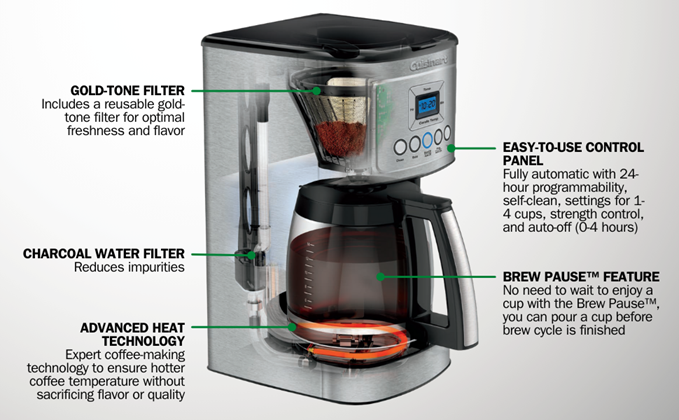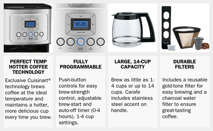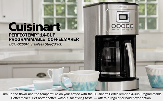 Turn up the flavor and the temperature on your coffee with the Cuisinart 14 Cup Programmable Coffeemaker! Using our cutting edge coffee technology, the 14 Cup Programmable Coffeemaker can give you hotter coffee without sacrificing taste. Choose a regular or bold flavor profile and set the brew-time up to 24 hours ahead so your next cup is ready when you are. The backlit LCD is easy-to-read, a ready tone can be turned on or off, and an indicator light signals when it’s time to decalcify. Refer to the user manual for troubleshooting steps. Features: Hotter Coffee with expert coffee-making technology to ensure hotter coffee temperature without sacrificing flavor or quality|Brew Strength Control allows you to select Regular or Bold coffee flavor|Fully Automatic with 24 hour programmability self clean 1–4 cup setting auto-off (0–4 hours) and optional ready alert tone|14 Cup Glass Carafe with decorative stainless steel handle|Easy-to-View Water Window for accurate filling Brew Pause™ feature lets you enjoy a cup of coffee before the brewing cycle has finished 60-Second Reset recalls settings and position in the brewing process in case of loss of power|Gold-Tone Coffee Filter and Charcoal Water Filter|Limited 3-Year Warranty