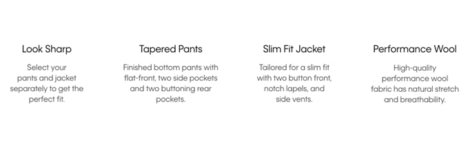 • The advantage of the Calvin Klein Slim Fit Suit Separate is the ability to customize your jacket and pant size. Select your sizes and add them to the cart separately.