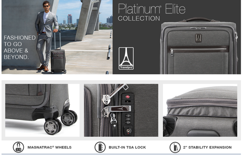 Finally, great looking checked luggage that is as functional and durable as it is stylish. The Platinum Elite 25" Expandable Spinner is perfect for medium and long trips, accommodating everything you need, guarding against wrinkles with a built-in suiter and keeping everything organized under a deluxe tie-down system with integrated accessory pockets. Constructed with premium fabrics, leather accents and chrome zippers, this gorgeous bag also features a tip-resistant tapered expansion option that provides up to 2" additional packing capacity. Integrated lock allows TSA authorities to safely unlock and lock suitcase for inspection when needed (default lock code is 0-0-0 to open). For effortless mobility, this 25" suitcase is equipped with our Precision Glide system-eight MagnaTrac, self-aligning, 360-degree spinner wheels guided by an adjustable PowerScope extension handle with patented Contour Grip and rubberized touch points, ergonomically designed to be easy on the hands. Backed by Travelpro built for a lifetime limited warranty with our trusted companion promise which covers the cost of repair for damage from airline or other common carrier for 1 year.