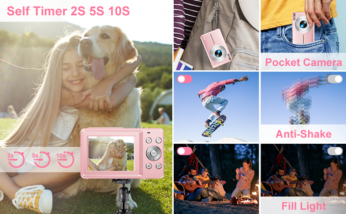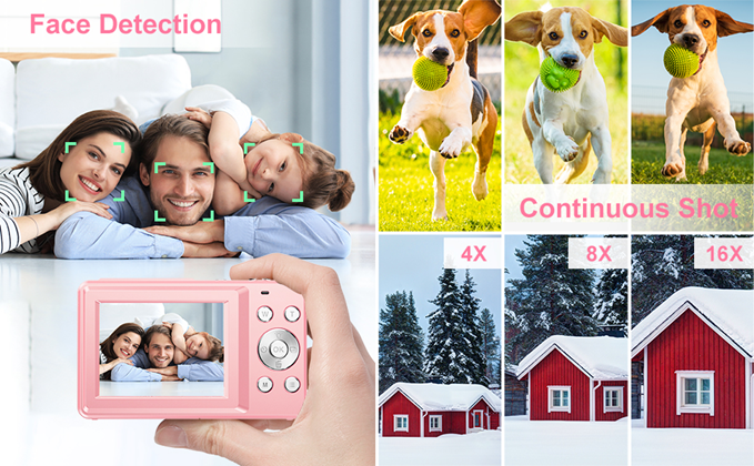 - [Multifunctional Digital Camera] Featured with fill light,anti-shaking,continuous shooting,face detection,smile capture,self-timer,internal microphone and speaker(record sound videos). This portable camera will allows you to capture the most exciting and memorable moments with high quality photos or videos. Totally fits your demand, have fun and record wonderful times with friends, family members and classmates.