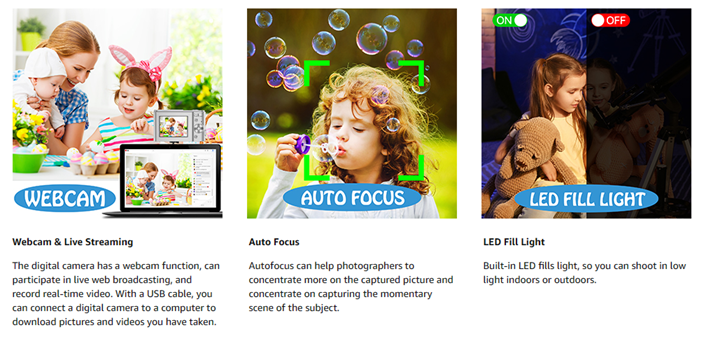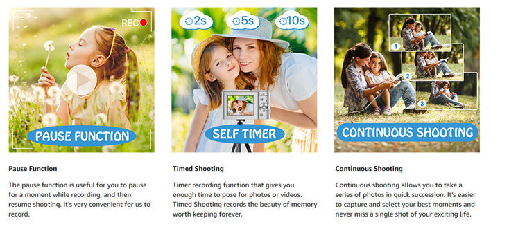 • 【Multifunctional & Best Gift】This digital camera point and shot support continuous shooting, Beauty face, anti-shake, face detection, smile capture, and Selfie timer functions. This camera is the best gift for grandparents, fathers, mothers, teenagers, children, and students, whether it is Mother's Day, Father's Day, Thanksgiving Day, birthday, and Christmas.
