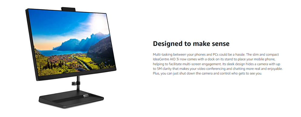 The IdeaCentre AIO 3i desktop computer is designed to perform and impress. This all-in-one computer is a pint-sized powerhouse, packing a wallop inside a compact chassis. Great things do come in the smallest packages, and housed in a sleek and compact frame, the Lenovo IdeaCentre AIO 3i delivers peak performance an 11th generation Intel® Core™ i3 processor, along with lightning-fast file transfer and boot times thanks to its 256GB SSD. Three-sided narrow bezels on the 22-inch FHD display and Harman®-certified stereo speakers make this the consummate family PC. It's great for personal productivity, working from home, or your child's schoolwork.Your household now has a store for its vast media library. Amass hundreds of movies and thousands of songs or videos with 256GB solid-state disk storage, which offers faster boot times, file transfers, and system responsiveness. Watch all of your favorites on the wide-angle full HD (1920 x 1080) touchscreen display, which also gives you more options for intuitive interaction with your computer - clicking and dragging files is easier than ever. This convenient AIO PC is made to make connecting simple, with a built-in webcam for videoconferencing and video chats that you can shut down for privacy. You'll also connect with wireless LAN (2x2 802.11 ac) and Bluetooth® combo card, plus multiple USB 2.0 and 3.2 ports, 1000 LAN, and HDMI™-out.