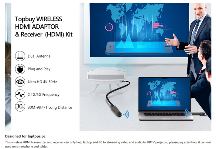 - [Plug & Play] No need any APP, simple connection can get the convenience of wireless streaming media.No software or WiFi connection required. Get up and running in 20 second with a true plug-and-play experience.which solves the problems for the traditional HDMI cable connection and wiring trouble, aesthetics affecting and the short transmission distance. Connect the transmitter to the HDMI source, then connect the receiver to the HDTV/Projector , connect the power, and you are ready to go.