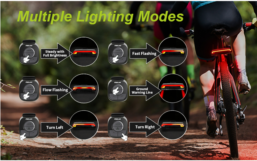 • ?【WIRELESS REMOTE CONTROL】Installed it on the handlebar, easy to switch the lighting modes of the bike rear light by press the four buttons on the controller. Total six lighting modes: (Steady with full brightness/ Fast Flash/ Flowing Light/ Turn Left/ Turn Right/ Ground Line).