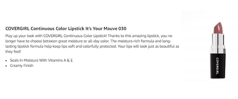 COVERGIRL Continuous Color Lipstick gives 2 benefits in 1. Six hours of wear plus locks in moisture with over 30% emollients. Contains Vitamin A and Vitamin E.