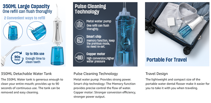 - LARGE 350ML WATER TANK & IPX7 WATERPROOF: With a large 350ml water tank, our water dental flosser provides sufficient water for teeth cleaning without the interruption of adding water repeatedly. The IPX7 waterproof design makes it easy to use the water dental flosser for showering in the bathroom. The detachable design allows easy cleaning of the interior.
