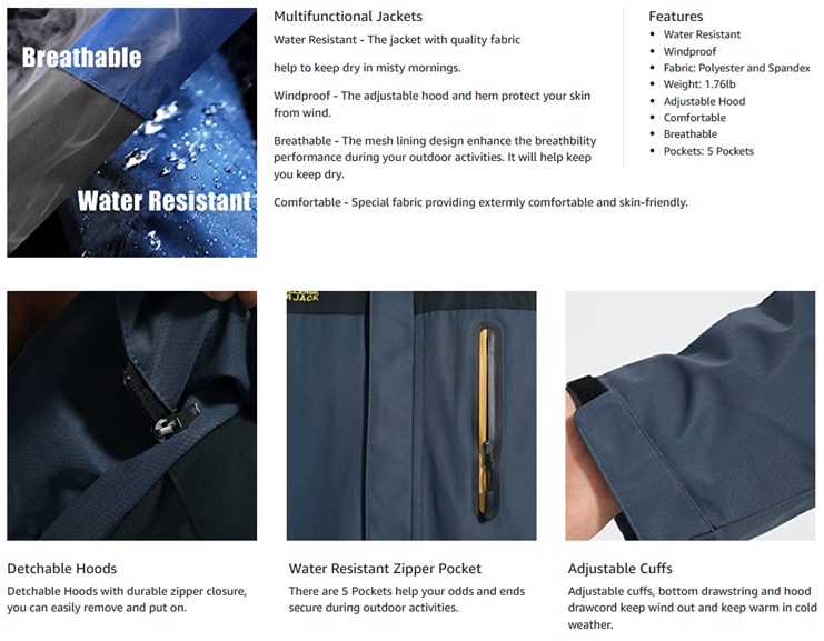 Outer: Windproof weather resistant soft shell Jacket,quick-dry material. Full-length zipper closure jacket with detachable & adjustable hood.