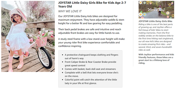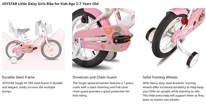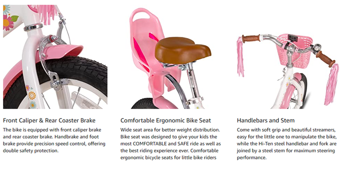 • 1. Amazing Design and Color! JOYSTAR Little Daisy Princess Girls bike with Bright colors, stylish and charming. DIY decals, beautiful basket and doll bike seat add extra fun to the ride. They have adjustable saddle & stem height for a better fit for easy pedalling. Complete with a bell that lets everyone know she's on the move.