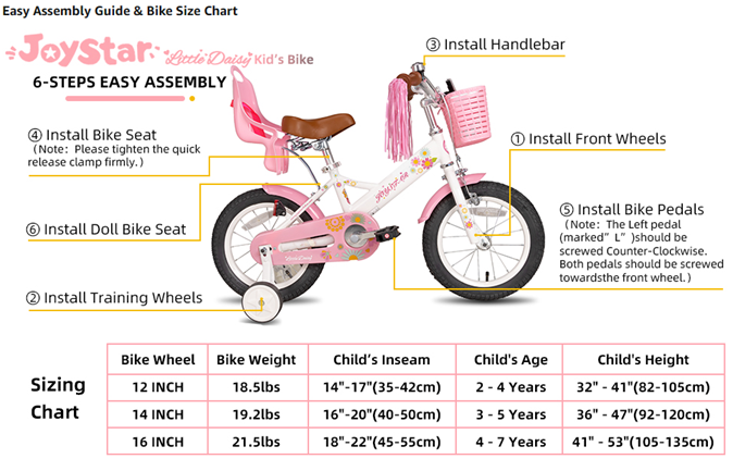 • 5. More Size Options! 12 inch bike is suitable for 2-4 years old (33-41 inch) girls; 14 inch bike is suitable for 3-5 years old (35 - 47 inch) girls; 16 inch bike is suitable for 4-7 years (41-53 inch) girls. Use our easy-to-follow size chart, you'll find a perfect size for your little beloved. Note: Please take the kids height into consideration.
