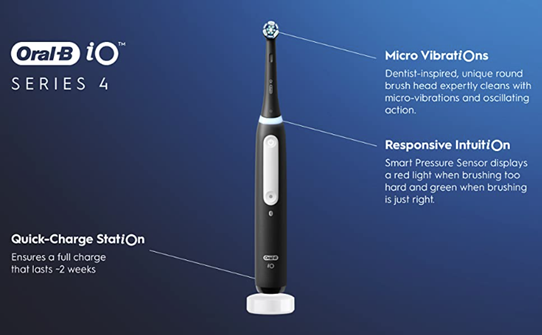 The iO is Oral-B’s best technology: Clinically Proven 500% More Plaque Removal Along Gumline versus a manual toothbrush. The i04 coaches you to a perfect clean. This is real time personalized coaching. The accompanying App shows your daily brushing report. Having 4 Brush Modes (Daily Clean, Whiten, Sensitive, and Super Sensitive) Oral-B is on your team for your everyday brushing task. A Round head and gentle micro-vibrations, the Magnetic interaction delivers smooth, harmonious motion through a Synchronized cleaning action (micro-vibrations synced with oscillations). A Built-in-2-Minute Timer ensures an even easier experience, helping you get an optimal clean on all your teeth. The Oral-B's quadrant timer breaks the two minutes up into four 30-second intervals to clean each quadrant of your mouth; we keep the time, so you don’t have to. Delivering the perfect pressure is done by having a Pressure Sensor. The Pressure Sensor Indicates optimal cleaning pressure and warns of over pressure. With an accompanying travel case, you’ll have a fresh clean everywhere you go. We’re with you on your next trip or even your mid-day on-the go brushing! Best of all, it is brought to you by Oral-B—the #1 brand used by dentists worldwide.* *Based on surveys of a representative worldwide sample of dentists carried out for P&G regularly.Do not use on children under age 3. Replace brush (head) every 3 months or sooner if brush head becomes worn.