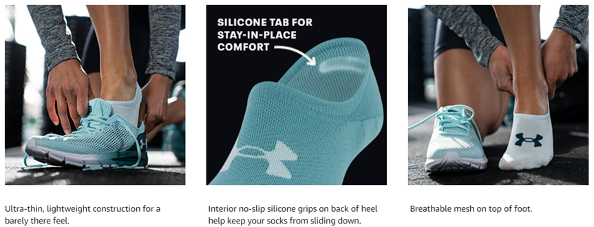 - Interior no-slip silicone grips on back of heel help keep your socks from sliding down