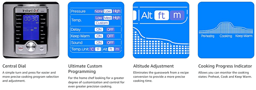 Instant Pot Ultra 10 In 1 Multi-Use Programmable Cooker is the next generation in kitchen appliances. Designed for the home chef looking for a greater degree of customization and control for even greater precision cooking. The Ultra combines the functions of a Pressure Cooker, Slow Cooker, Rice/Porridge Cooker, Cake Maker, Yogurt Maker, Saute/Searing, Steamer, Warmer, Sterilizer, and, a truly new and unique feature, the ultra-program. The 'Ultra' provides complete custom programming for pressure and non-pressure cooking. Now, one can set the exact parameters desired to achieve perfect results each and every time. With the 'Altitude' adjustment, the guesswork is eliminated from a recipe conversion providing a more precise cooking time. Designed with a large, blue LCD display with a 'Cooking Indicator' to provide one a clear visual on the progress of your dish from preheating, cooking, and Keep Warm. A central dial with a simple turn and press provides added precision in program selection and adjustments. And, the new - 'Steam Release Reset Button' ensures the safer handling of the steam release after cooking is completed. Built with 16 smart programs: Soup/Broth, Meat/Stew, Bean/Chili, Cake, Egg, Slow Cook, Saute/Searing, Rice, Multigrain, Porridge, Steam, Sterilize, Yogurt, Warm, Pressure Cook, and Ultra. Now, your favorite dishes are as simple as selecting your preferences and having them ready up to 70% faster. With the 'Sterilize' program one can pasteurize dairy products, sterilize baby bottles, jars, and utensils; As well as, perform certain types of canning much more conveniently than ever before The 'Cake Maker' is designed to prepare soft and moist cakes and the 'Egg' prepares perfect eggs in just a few minutes. America's most trusted brand has moved into a category of its own with the Instant Pot Ultra Delay Start time - Up to 24 hours.How It Works:The microprocessor carefully runs lab-tested algorithms to control the time, cooking pressure and temperature to ensure consistent cooking results. Users can customize these settings to control pressure level, adjust cooking time and a cancel button, allowing one to achieve their preferred cooking results. For instance, the “meat/stew” key is programmed to prepare perfectly tender, thoroughly heated meat dishes; however, users can attain fall-off-the-bone results by adjusting the cooking time.The fully sealed environment traps the flavors, nutrients, and aromas of the food instead of releasing them throughout the home. During pressure-cooking, heat is distributed evenly, deeply and quickly once pressure is built. In addition, minimal water is required for steaming so vitamins and minerals are not leached or dissolved. As a result, greens retain their bright colors and phytonutrients, meats and bones are thoroughly cooked yet tender, and whole grains and beans are soft and delicious, all with remarkable consistency.Designed to cater to varying tastes and food conditions, Ultra has adjustable settings to achieve one’s desired cooking results; 3 temperatures in ‘Sauté’ for searing, simmering or thickening for a maximum time of 30 minutes, and 3 temperatures in ‘Slow Cook’ to complete the tasks of a common slow cooker, ‘Keep Warm’, and 3 temperatures in ‘Warm’ to preheat food.The 24-hour delay start allows users to postpone the cooking start to have dinner ready when you are. Automatic ‘Keep Warm’ holds the temperature of the meal until you are ready to serve. With the ultra, one can easily turn the ‘Keep Warm’ function on/off. Power supply: 120V – 60Hz.