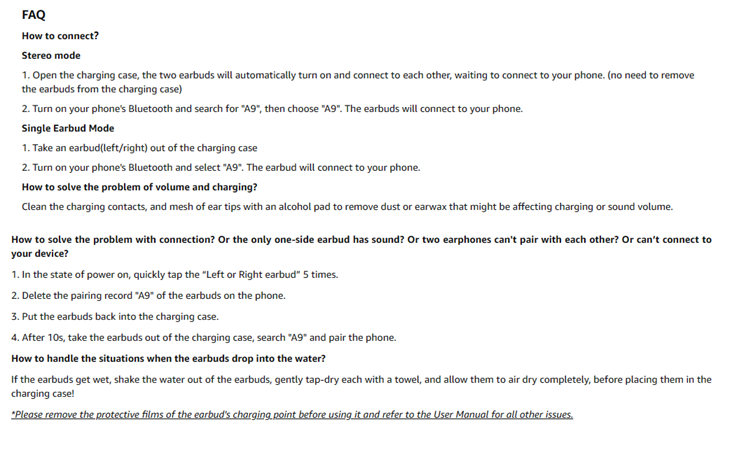 - Package Contents - Earphones * 2, Eartips * 6, USB C Cable * 1, User Manual * 1, and friendly customer service. ( *Please remove the protective films of the earbud's charging point before using it and read the “User Manual” carefully, any problem please contact us by Amazon)