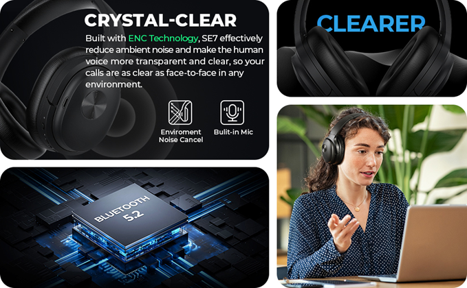 - Crystal Clear Calls, Anytime, Anywhere - With premium built-in microphones and ENC technology, our SE7 wireless headphones provide crystal clear and stable hands-free calls. No more poor or intermittent conversations. As SE7 headphones with mic, stay connected with your circle wherever you are.