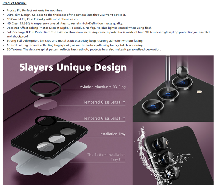 • 【Military Level Protection】The Camera Lens Protector for Samsung Galaxy S23 Plus is made of tempered glass and stainless steel. It can fall from 12 feet for more than 8000 times without being damaged. It is sturdy, durable, scratch resistant and fingerprint resistant.