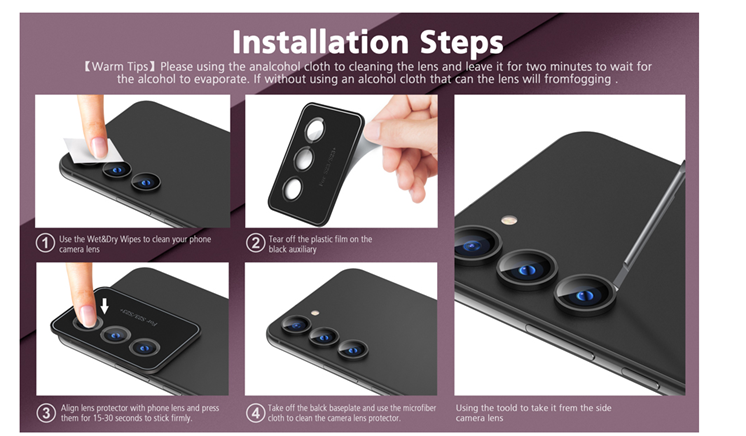• 【Simple Bubble Free Installation】Our innovative simple installation artifact ensures that you can quickly, accurately and bubble free install the Lens Protector for Samsung Galaxy S23 or S23 Plus. Please clean the lens before installation.