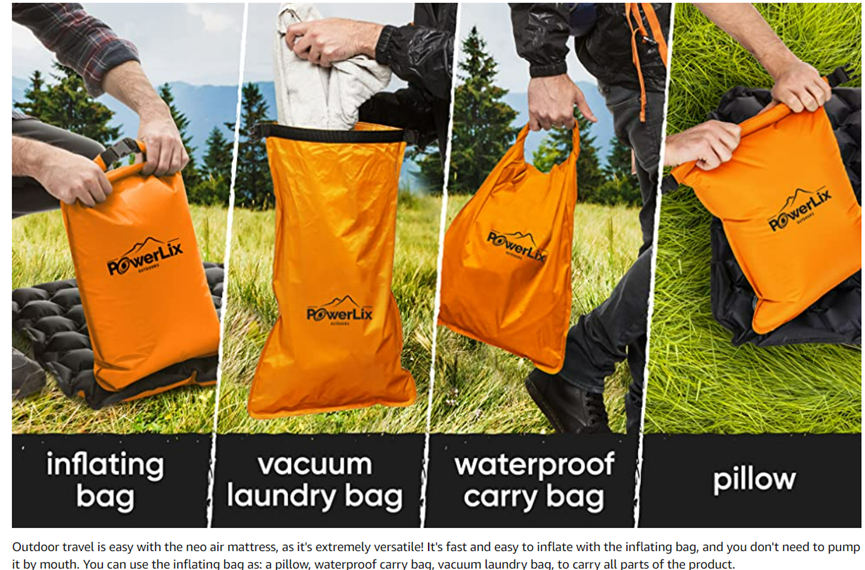 - Everything You Need for Outdoors: This exclusive item comes with a Sleeping Pad, carry bag, 2 repair kits, and an inflating bag. A patch kit is also included, stitched into the top of the storage bag. The inflating bag was designed with you in mind, for all of your needs. In addition to inflating the mattress, it can be used for several different things, such as a pillow, a waterproof carry or laundry bag, or to carry the sleeping mat itself!
