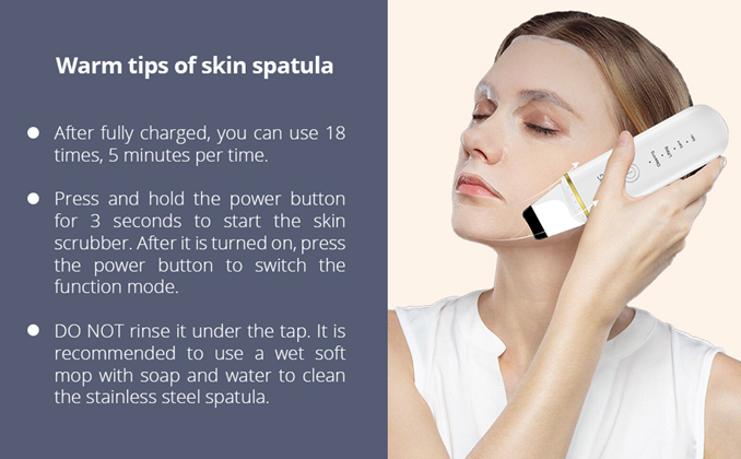 • Convenient Facial Spatula: The 3D stainless steel spatula makes the facial spatula easy to cleanse every little corner of the face without leaving a mark, such as the side of the nose and between the mouth. Easily charged with USB Port. The skin scraper is small enough to take with you to the gym, or on vacation. It can be used everywhere.