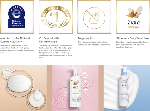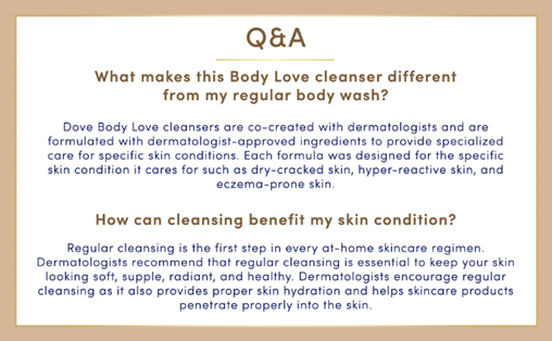 Care for your skin condition now starts in the shower with the Dove Body Love Eczema-Prone Skin Care Body Cleanser with Colloidal Oatmeal to help soothe dry-itchy skin. The paraben-free and sulfate-free body wash is made with plant-based cleansers and 10x Moisture Restore Complex* to transform even the driest skin in just one shower. How To Use: Squeeze a generous amount of Dove Dry-Cracked Skin Replenish Body Cleanser into your palms, or onto a loofah. Naturally, derived cleansers help this body cleanser create a luxurious lather. Smooth the gentle body wash formula over your body and allow the light lather to caress, smooth, and hydrate skin. Rinse with warm water to reveal skin that feels moisturized, smooth, and soft. This body cleanser is Certified PETA VEGAN, and is made in 100% recycled plastic bottles, so you can feel good about switching to Dove. At Dove, our vision is of a world where beauty is a source of confidence, and not anxiety. So, we are on a mission to help the next generation of women develop a positive relationship with the way they look—reaching over ¼ of a billion young people with self-esteem education by 2030. We are also committed to a landmark new initiative as part of our 2025 commitment to reduce plastic waste; reducing over 20,500 metric tons of virgin plastic annually by making the iconic beauty bar packaging plastic-free globally; launching new 100% recycled plastic bottles; and trialing a new refillable deodorant format that radically reduces plastic use. As one of the largest beauty brands in the world, we are revealing an agenda setting commitment to tackle the global beauty industry’s plastic waste issue. *10x the moisturizers of the next leading body wash.