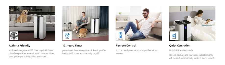 • <b>MEDICAL-GRADE FILTRATION:</b> Ture HEPA Air Purifier Large Room, H13 Ture HEPA filters filter 99.97% of fine particles (as small as 0.1 microns) as well as dust, pet dander; while also absorbing smoke, wildfire smoke, cooking odors, pet odors, and VOCs.