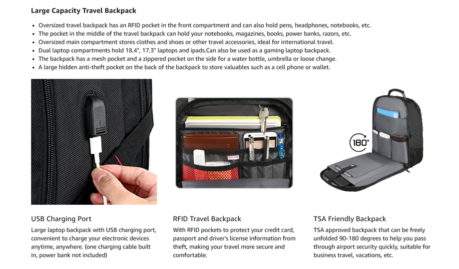 - TSA friendly backpack can be opened freely 90-180 degrees and fastly through airport security.