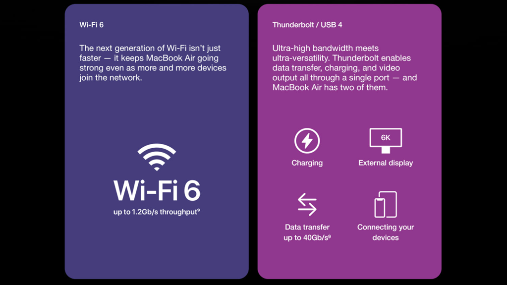 Charging and Expansion | Two Thunderbolt / USB 4 ports with support for: Charging, DisplayPort, Thunderbolt 3 (up to 40 Gbps), USB 3.1 Gen 2 (up to 10 Gbps) |