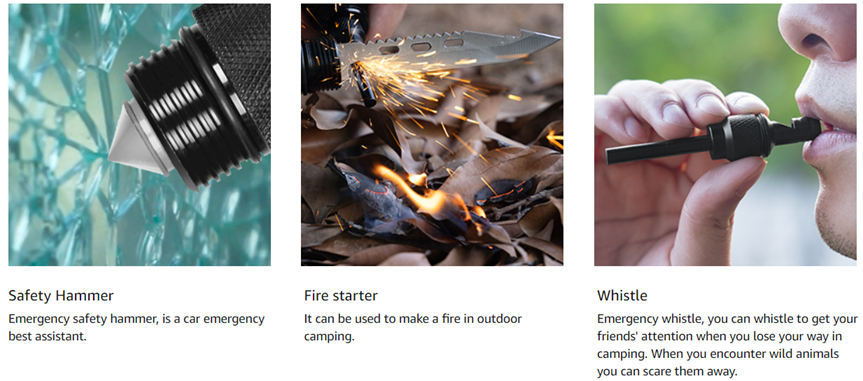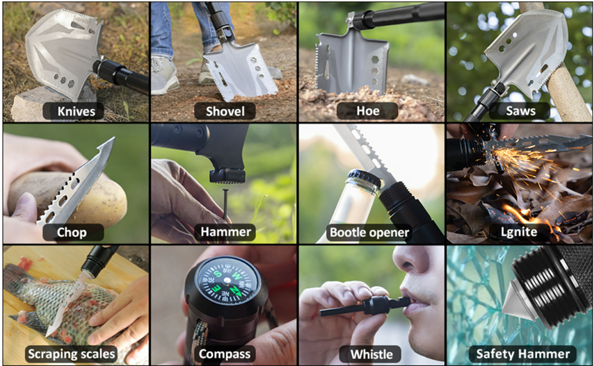• Multifunctional Survival Tool: Camping shovel includes shovel, axe, knife, saw, hoe, hook, stick, and spanner, a corkscrew, whistle,igniter, ice cone, fish scale, compass, etc., Very suitable for chopping, shoveling, cutting, sawing, digging, mining, hammering, and bottle opening.Ready for you anytime and anywhere.