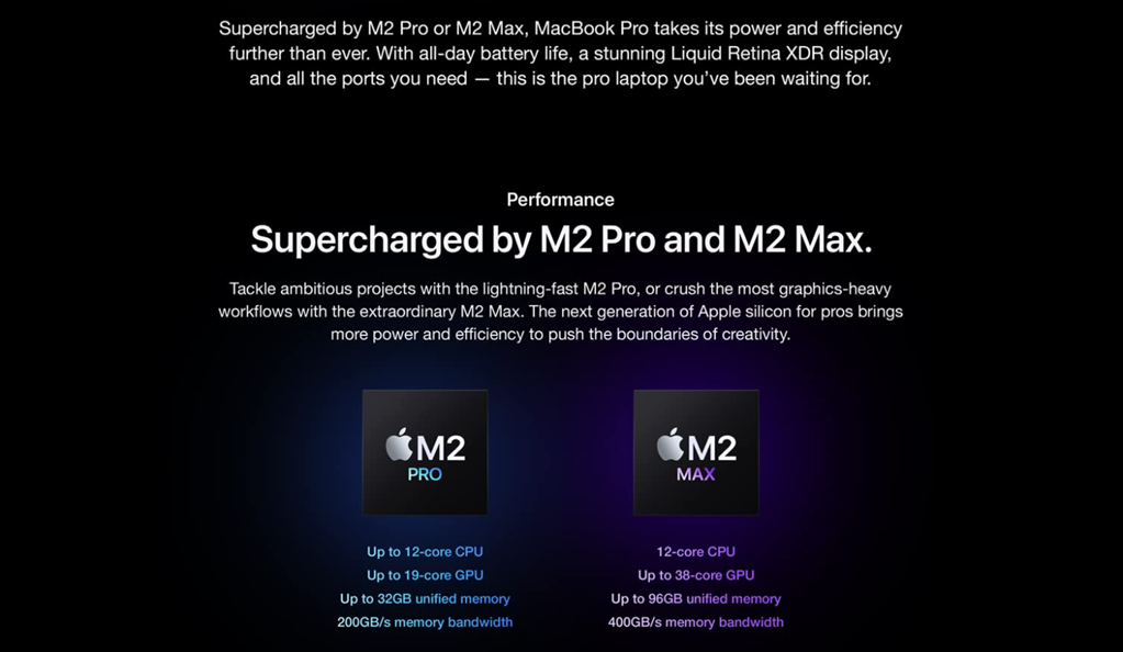 Processor | System on Chip (SoC), Apple M2 Pro or M2 Max chip, 12-core CPU with 8 performance cores and 4 efficiency cores, Up to 38-core GPU, 16-core Neural Engine, Up to 400GB/s memory bandwidth |