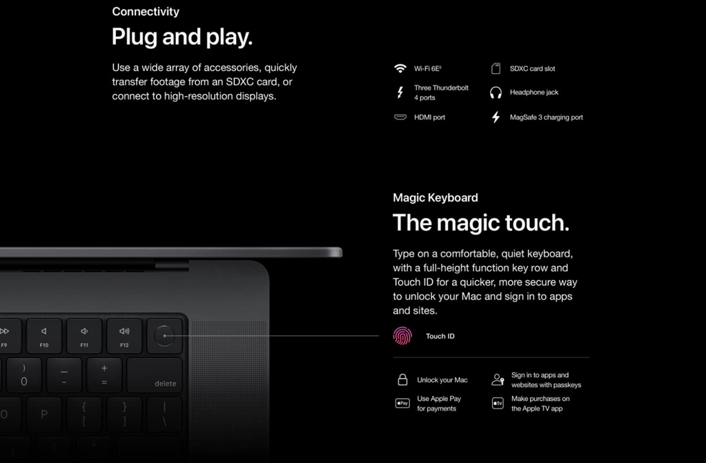 Charging and Expansion | Three Thunderbolt 4 (USB-C) ports with support for: Charging, DisplayPort, Thunderbolt 4 (up to 40Gb/s), USB 4 (up to 40Gb/s); SDXC card slot, HDMI port, 3.5 mm headphone jack, MagSafe 3 port |