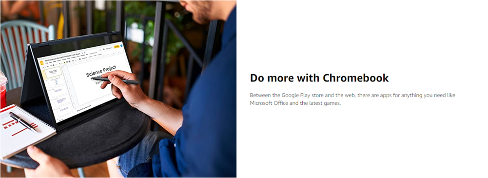 - Laptop or tablet – why not both? With a 13" FHD touchscreen, you can use your Lenovo Chromebook the way that works best for you to browse online, listen to music, stream movies, or video chat with friends