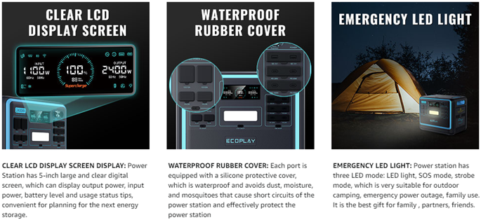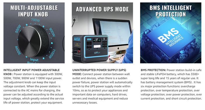 • 【 INTELLIGENT INPUT SETTING KNOB】Ecoplay portable power station has adjustment input power knob, include 300W, 500W, 700W, 900W and 1100W input power. You can adjust the charging time of the AC charger effectively and flexibly control the time. It can be adjusted not only by adjusting the device according to the input power but also by preventing the device from being damaged by voltage instability.
