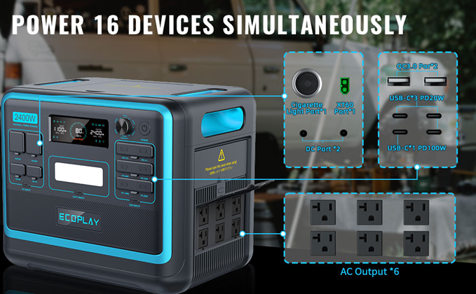• 【POWER 16 DEVICES SIMULTANEOUSLY】The portable power station can charge 16 devices at the same time. it features with 6* AC Outlets (2400W power, 110V/50Hz-60Hz pure sine wave), 2*DC Outputs (12V/3A), 1*XT-60 Output(12V/25A), 1*Car Charging Output(12V/10A), 2* USB-A QC3.0 Port (5-12V 18W fast charging), 3* USB-C Port (5-20V/ 20W), 1* USB-C Port (5-20V/ 100W Max). 1 * Anderson Input, Car Charger Input. Compatible with more than 99% of electrical devices.