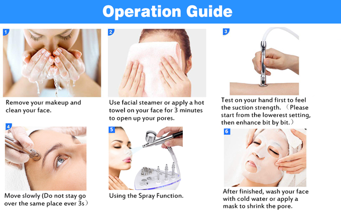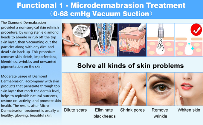 • ?【For Facial Skin and Body Care】 Suitable for all skin types, heads of diamonds not only for facial skin, but also for body care. The microdermabrasion machine is equipped with 9 shaped diamond head of different functions,it has adjustable vacuum intensity to adapt to different area treatment