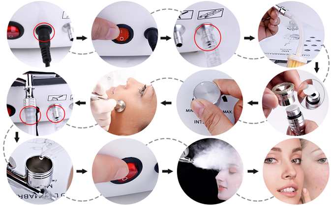 • ?【Note】Please do not use two functions at the same time, one white tube into the machine only. Oxygen injection nozzle button pull backwards,so as to control the spray size