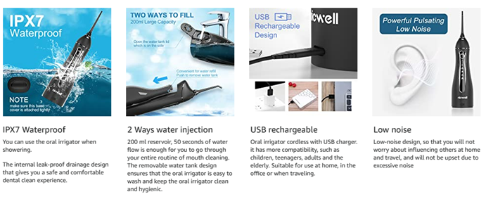 POWERFUL BATTERY LIFE & IPX7 WATERPROOF: With powerful and environmental lithium battery, fully charged need 4 hours and used continuously for about 21 days. Come with USB Cable(Adapter Not Included) applicable to a variety of charging equipements such as power bank, computer, laptop.... With double-sealing rings, Nicwell oral irrigator prevent water leakage reliably, can use for shower in the bathroom and it's washable to clean
