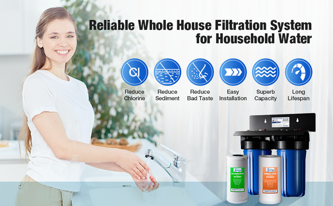 [Two-Stage Effective Filtration] The whole house water filter has 1st-Stage premium 5-micron polypropylene sediment filter (FP15B) captures dirt, sand, silt, dust, rust, and scale particles, using high quality coconut shell carbon and highly compact fabrication tech, 2nd-stage CTO filter(FC15B) knocks out cloudiness as well as bad tastes and odors, removes over 90% of chlorine, and is highly effective on VOCs like pesticides, herbicides, and industrial solvents.