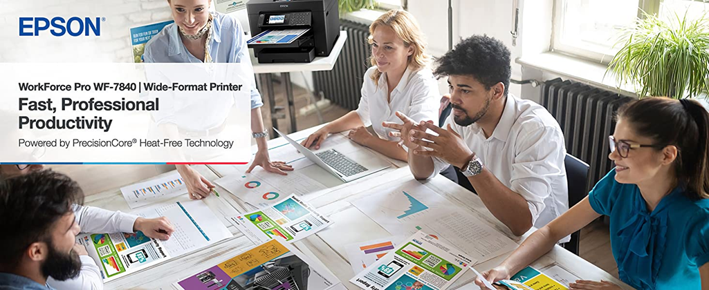 Supercharge workplace efficiency and productivity with the ultra fast WorkForce Pro WF-7840. Offering high-speed wide-format printing, this reliable all-in-one consistently delivers sharp, professional-quality, prints using innovative PrecisionCore Heat-Free Technology and vivid DURABrite Ultra inks. Built from the ground up to meet the demands of fast-paced businesses, the WF-7840 tackles a variety of tasks with wide-format printing up to 13" x 19", auto 2-sided print, copy, scan and fax, a 50-sheet rear tray, and a large, 500-sheet paper capacity. Convenient and easy-to-use, this complete duplex solution offers an abundance of features for simplified operation and navigation, including a 4.3" color touchscreen and wireless setup using mobile devices (1).This product uses only genuine Epson-brand cartridges. Other brands of ink cartridges and ink supplies are not compatible and, even if described as compatible, may not function properly.† Black and color print speeds are measured in accordance with ISO/IEC 24734. Actual print times will vary based on factors including system configuration, software, and page complexity. For more information, visit our official site.1. Requires Epson Smart Panel app download and a compatible smart device. Data usage fees may apply. For more information, please visit our official site.2. Most features require an Internet connection to the printer, as well as an Internet- and/or email-enabled device. For a list of Epson Connect enabled printers and compatible devices and apps, visit our official site.3. Wi-Fi CERTIFIED; level of performance subject to the range of the router being used. Wi-Fi Direct may require printer software.4. Based on comparing manufacturers’ reported TEC values of the best-selling, similarly featured color laser printers priced similarly (USD) or less with print speeds of 40 ppm or less as of February 2020.5. For convenient and reasonable recycling options, visit our official site.6. SmartWay is an innovative partnership of the U.S. Environmental Protection Agency that reduces greenhouse gases and other air pollutants and improves fuel efficiency.