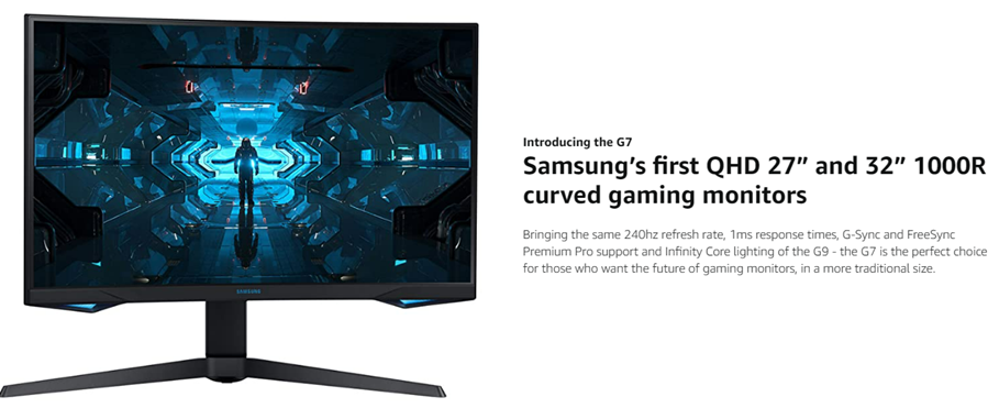 SAMSUNG Odyssey G7 Series 27-Inch WQHD (2560x1440) Gaming Monitor, 240Hz, Curved, 1ms, HDMI, G-Sync, FreeSync Premium Pro (LC27G75TQSNXZA)