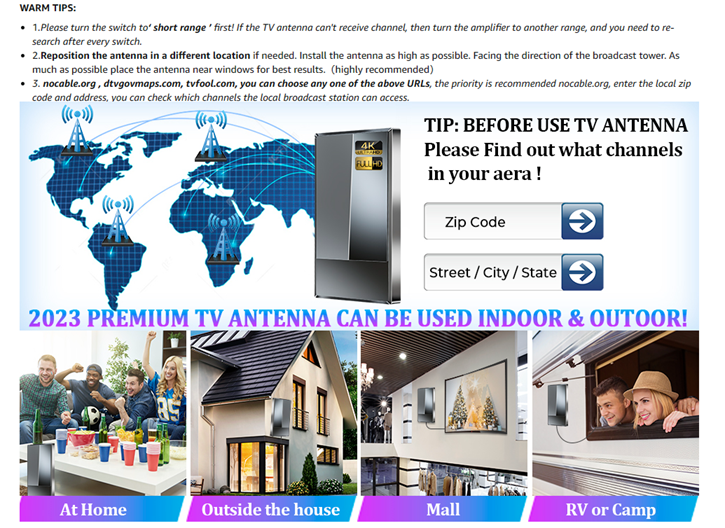 - ?▷【INDOOR/OUTDOOR ANTENNA FIT ANYWHERE 】- Easy install in Minutes. Give your home a modern decoration with this Unique and Fashional Design TV antenna. Three optional installation methods, including nail on the wall, sticks on the window or tie to shelf.Vertical or horizontal placement is allowed!You can place antennae in your home, underground garage , company, outdoor square for the best signal and the strongest reception. It also works as an outdoor antenna in RV or tent on your next trip!